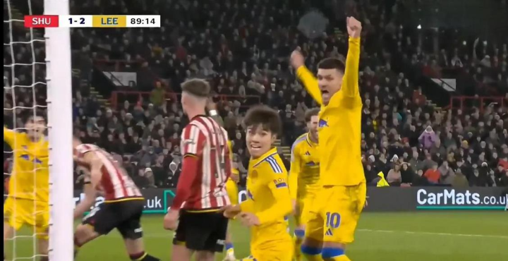 这场比赛是利兹联冲超的关键战役,他们在客场对阵谢菲尔德联。利兹联全场控球率58%,总共射了18脚,其中有8脚射正,占据了场上的主动权,并最终实现了逆转。比赛开始第14分钟,利兹联的球员梅利耶不小心打进了一个乌龙球,让谢菲尔德联1:0领先。不过,利兹联在比赛快结束时发起了猛烈的反击。第72分钟,詹姆斯助攻菲尔波进球,将比分扳成1:1平。第89分钟,菲尔波回敬了詹姆斯的助攻,帮助田中碧进球,利兹联2:1反超了比分。紧接着,在第90分钟,詹姆斯再次送出助攻,皮罗埃再进一球,利兹联3:1锁定了胜局。值得一提的是,谢菲尔德联在这场比赛中有两次射门都打在了门框上,真是有点背啊!